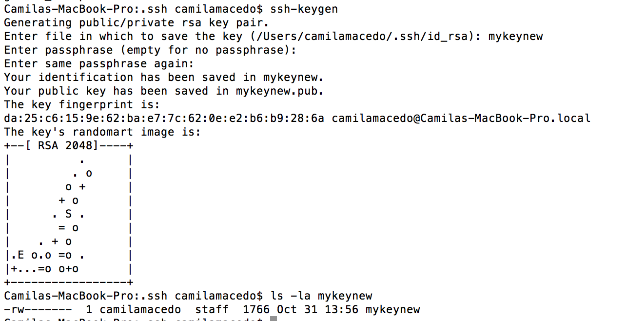 CommandLine : How to generate a public key with my mac ? camilamacedo86October 31, 2015October 31, 2015CommandLine Post navigation PreviousNext For do this you need use the command : ssh-keygen Example: Observation: all keys are in ~/.ssh directory. Share this: Click to share on X (Opens in new window) X Click to email a link to a friend (Opens in new window) Email Click to print (Opens in new window) Print Click to share on LinkedIn (Opens in new window) LinkedIn Click to share on Reddit (Opens in new window) Reddit Click to share on Tumblr (Opens in new window) Tumblr Click to share on Pinterest (Opens in new window) Pinterest Click to share on Pocket (Opens in new window) Pocket Click to share on Facebook (Opens in new window) Facebook Like Loading... Related