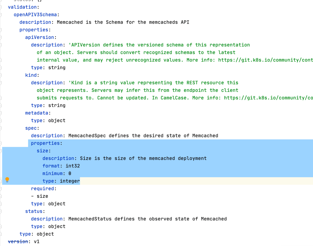 In this example, we will define that the Memcached Kind (CRD) will have the attribute size which will specify the quantity of Memcached instances will be deployed. Also, we will create an attribute to its Status which will store the Pod Names. Note that, the status field here is just to illustrate the idea but for it would be recommended use Conditionals instead of that.